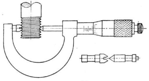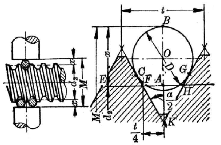 測量時,將三根精度很高、直徑相同的量針放在被測螺紋的牙凹中,用測量外尺寸的計量器具如千分尺、機械比較儀、光較儀、測長儀等測量出尺寸 。再根據(jù)被測螺紋的螺距 、牙形半角 和量針直徑 ,計算出螺紋中徑 。